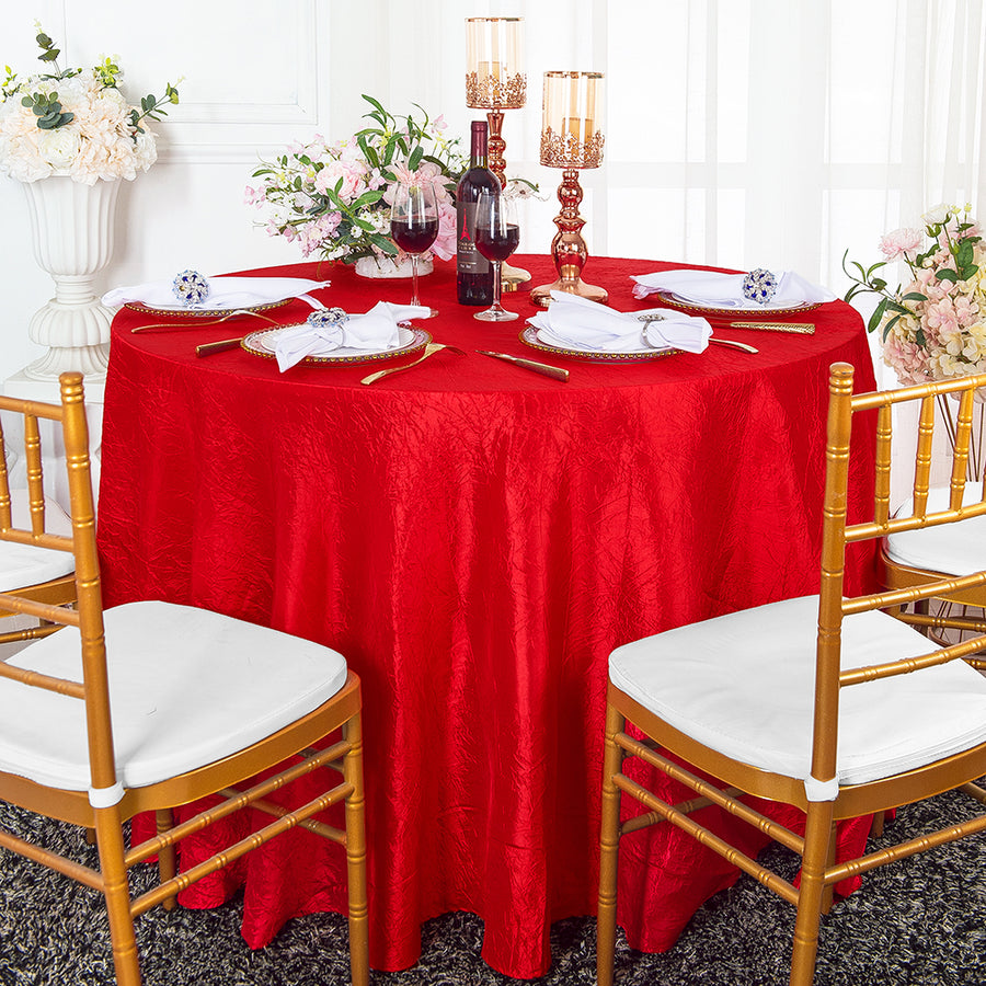 Vente en gros de nappes en taffetas écrasé rouge de 120 pouces pour le linge de mariage, nappe ronde en taffetas écrasé froissé, housse de linge de table, couvertures de table dans de nombreuses couleurs.